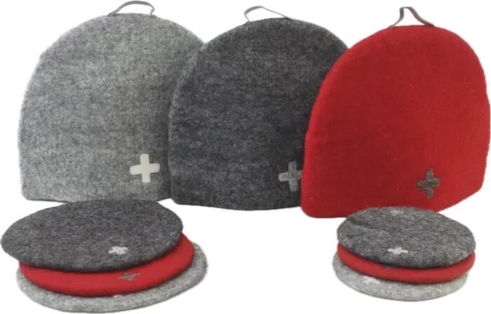 フェルトの制作はすべて手仕事で、羊毛にアルカリ性である石鹸水を含ませてもんだり巻いて転がしたりして縮絨(しゅくじゅう)させ成形します。とても手間のかかる作業です。プラスのシルエット部分は針で何度も刺し、フェルト地にからませていくニードルポイント手法で制作します。ひとつひとつ、少し違う手作り感に愛着がわいてきます。別売りのティーコゼやコースターと合わせてもかわいいです。