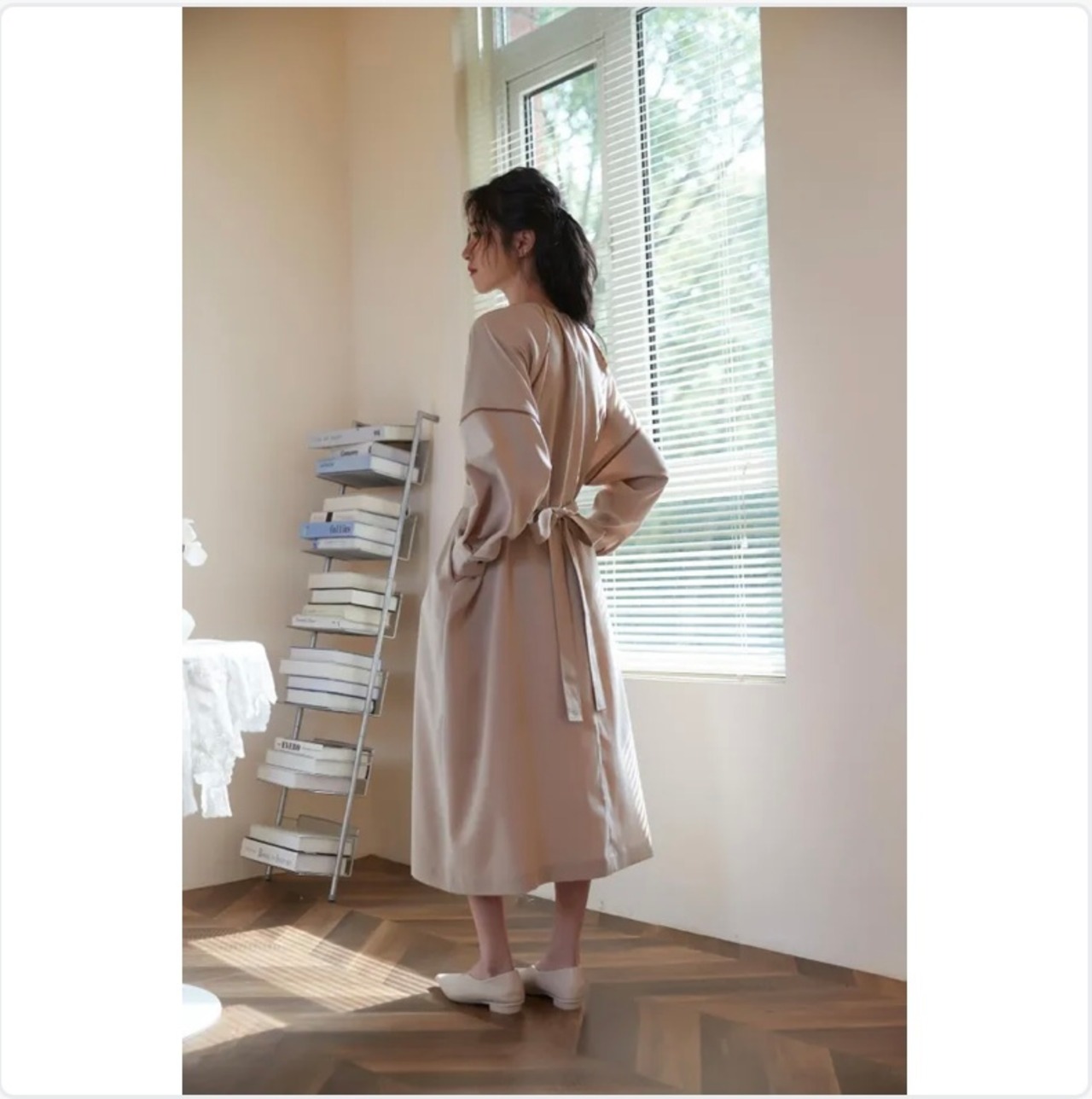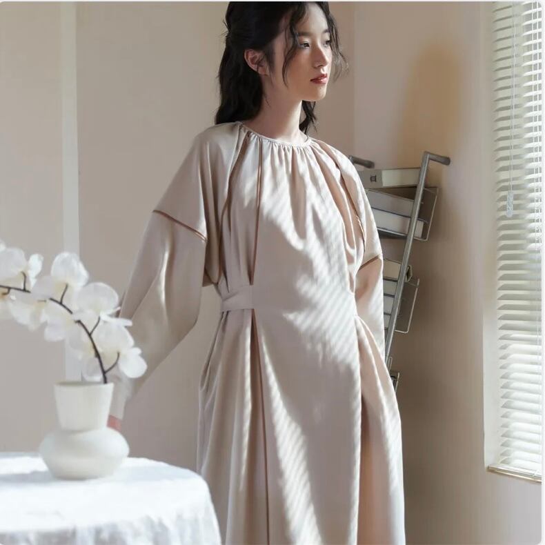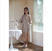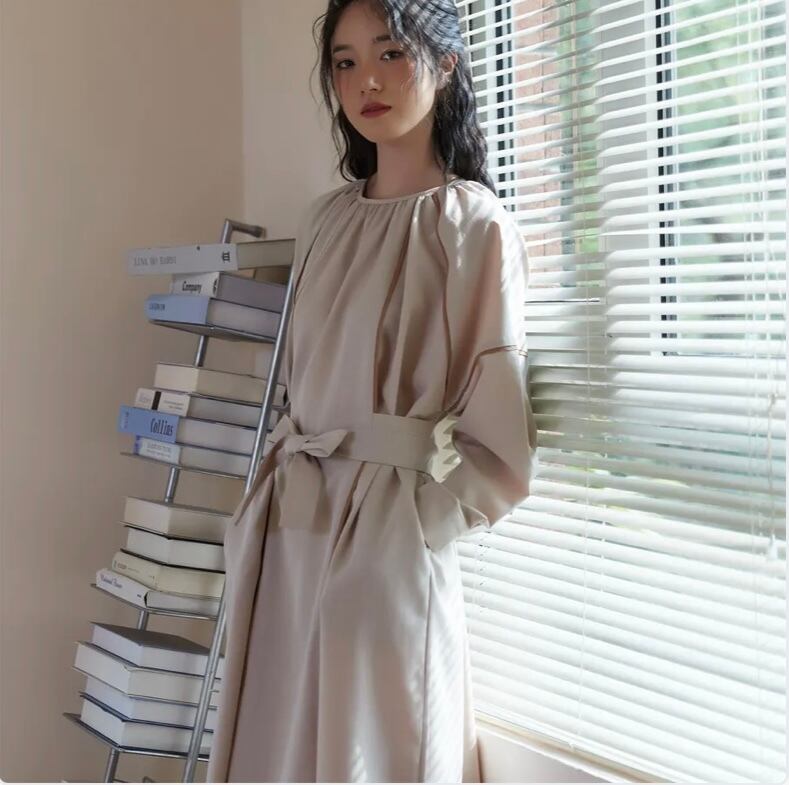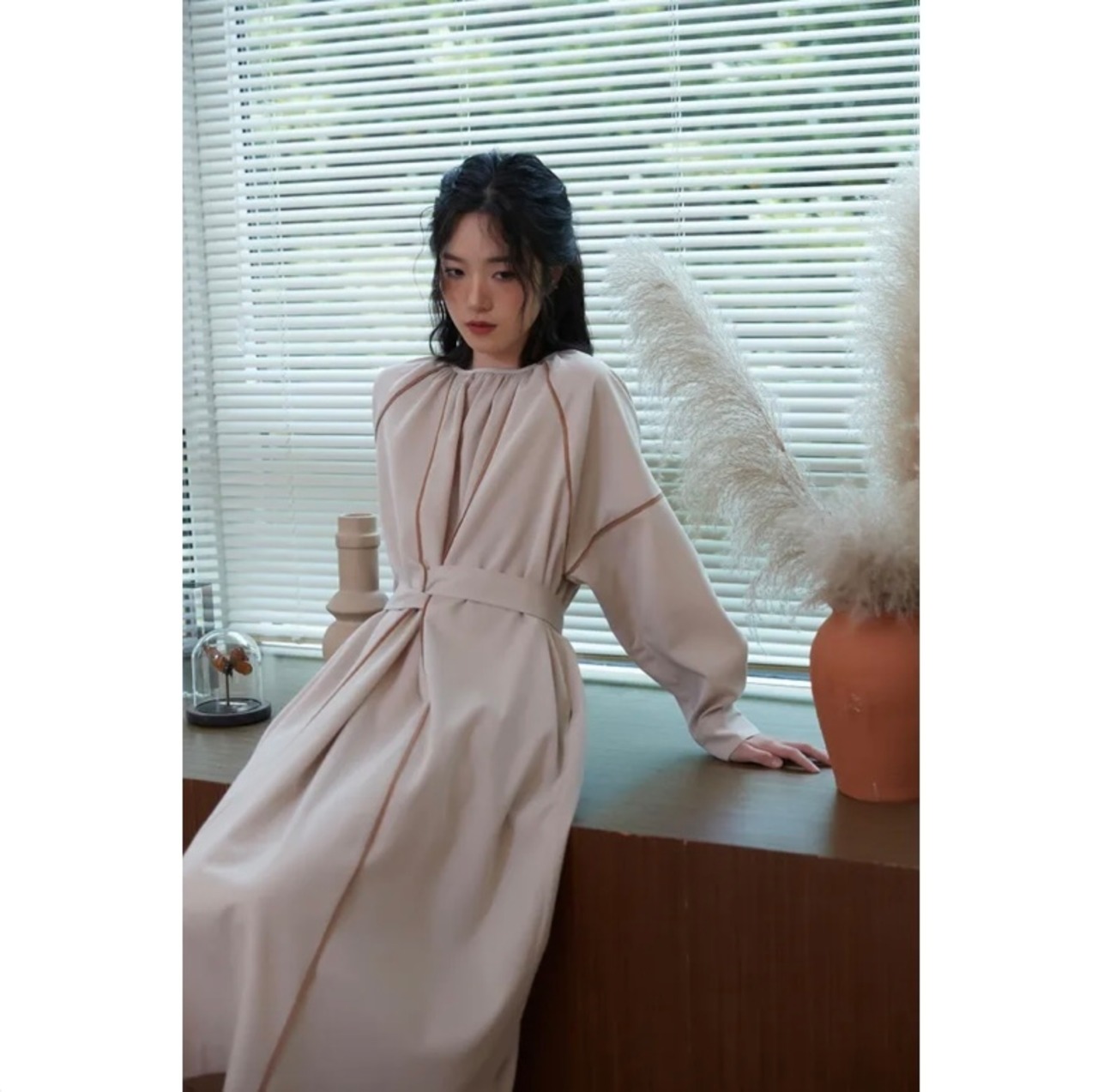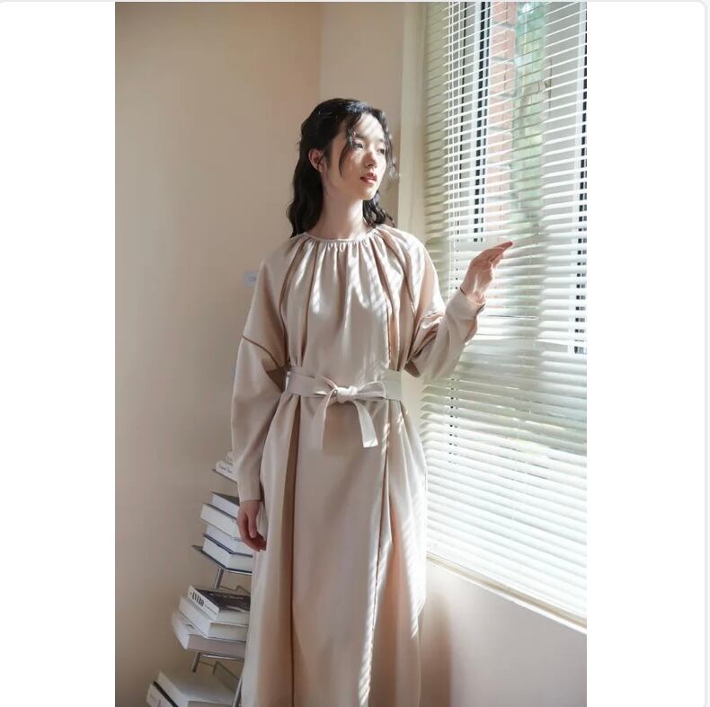 このワンピースは、パイピングディテールとベルトが特徴のアイテムで、繊細なパイピングディテールがデザインのアクセントとなり、エレガントな雰囲気を演出します。