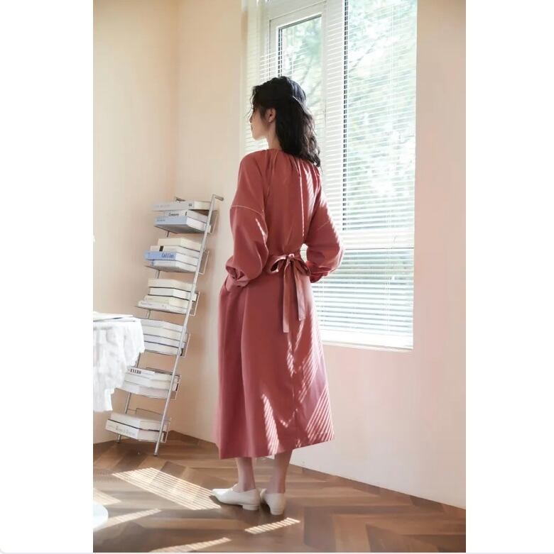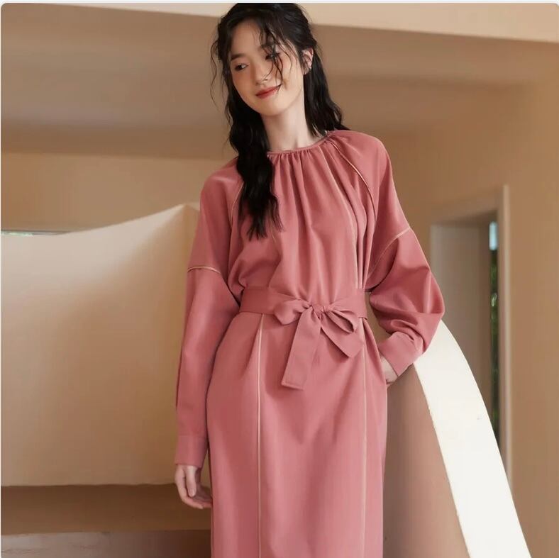 このワンピースは、パイピングディテールとベルトが特徴のアイテムで、繊細なパイピングディテールがデザインのアクセントとなり、エレガントな雰囲気を演出します。