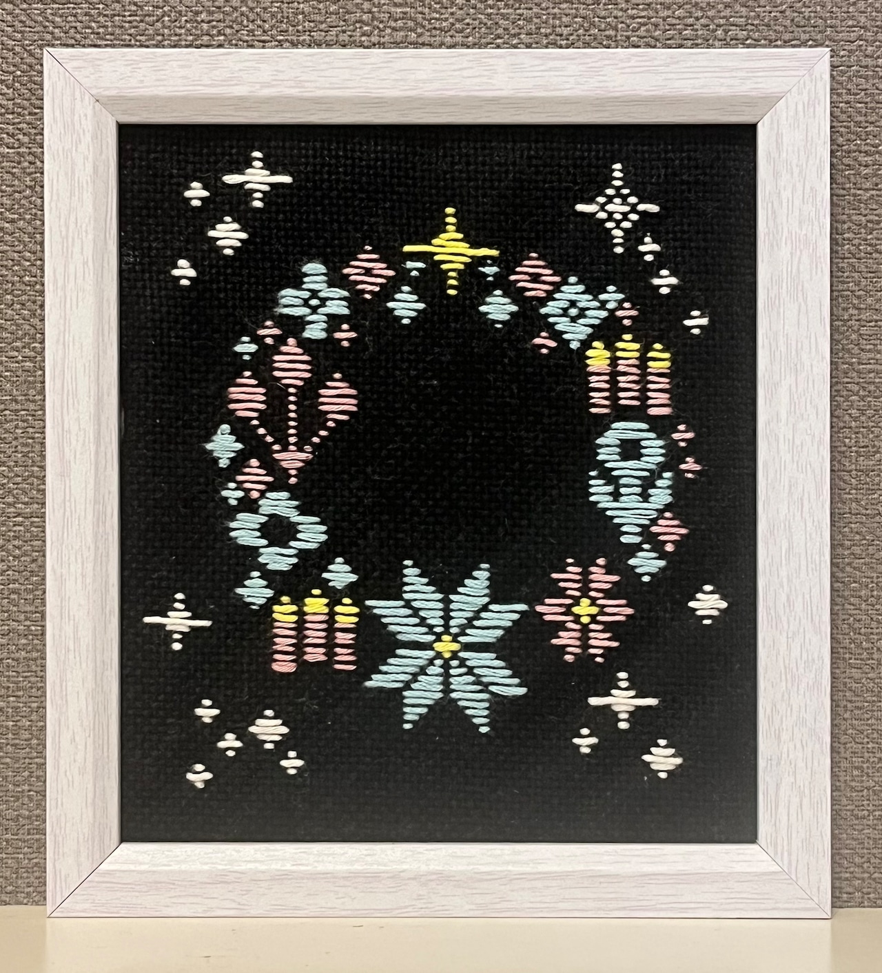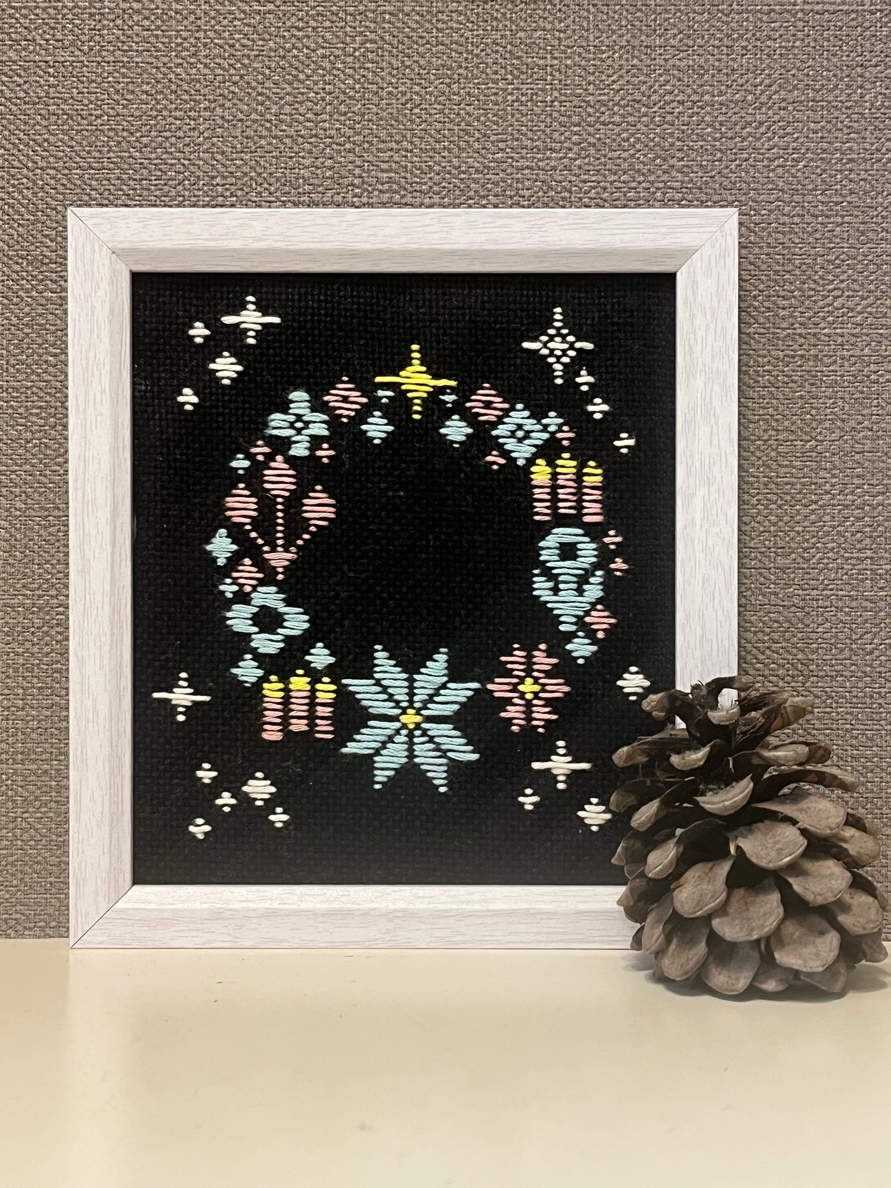 こぎん刺しの技法でクリスマスリースの模様を刺しました。